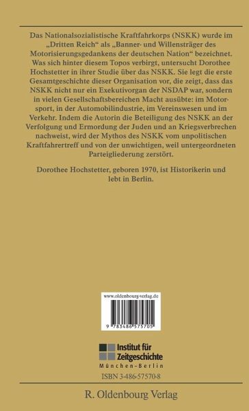 Das Nationalsozialistische Kraftfahrkorps (NSKK) wurde im "Dritten Reich" als "Banner- und Willensträger des Motorisierungsgedankens der deutschen Nation" bezeichnet. Was sich hinter diesem Topos verbirgt, untersucht Dorothee Hochstetter in ihrer Studie über das NSKK. Sie legt die erste Gesamtgeschichte dieser Organisation vor, die zeigt, dass das NSKK nicht nur ein Exekutivorgan der NSDAP war, sondern in vielen Gesellschaftsbereichen Macht ausübte: im Motorsport, in der Automobilindustrie, im Vereinswesen und im Verkehr. Indem die Autorin die Beteiligung des NSKK an der Verfolgung und Ermordung der Juden und an Kriegsverbrechen nachweist, wird der Mythos des NSKK vom unpolitischen Kraftfahrertreff und von der unwichtigen, weil untergeordneten Parteigliederung zerstört.