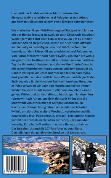 Hier wird das Erlebte auf einer Motorradreise über die naturschöne griechische Insel Peloponnes und Athen, aus Sicht des Bikers mit seinem zwölf jährigen Sohn berichtet. Wir starten in Illingen Württemberg bei Stuttgart und fahrenmit der Honda Transalp zu zweit bis nach Kötschach-Mauthen.Weiter geht die Fahrt nach Lido di Jesolo, um uns zu erholen und den Strand zu genießen, so wie die historische Altstadt von Venedig zu besichtigen. Von dort führt die Tour über Venedig auf dem Fährschiff zur griechische Insel Peloponnes.Von Patras fahren wir nach Kastro Kyllini, genießen ein wenigdie griechische Gastfreundschaft u. schauen uns am nächstenTag die Hafenstadt Katakolo und das weltberühmte Olympia mit seinen historischen Ausgrabungen und dem Museum an.Danach verlegen wir unser Quartier und fahren nach Pylos,dort genießen wir das herrlich blaue Wasser und die perfektenStrände, wie z.B. die Navarino Bucht mit Insel und Burgruine.In Pylos verweilen wir über eine Woche und fahren immerwieder mal eine Runde in das Inselinnere, um schön essen zu gehen, Dörfer und Landschaften zu besichtigen. Im Anschluss reisen wir nach Athen, um die Hafenstadt Piräus und dieInnenstadt von Athen mit der Akropolis anzuschauen.Nach einer Übernachtung fahren wir wieder nach Kastro Kyllini , um dort eine weitere Woche zu verbringen und dienaturschöne Insel Peleponnes zu erleben. Letztendlich starten wir mit der Transalp nach Patras zur Fähre, um dann überVenedig, Kötschach-Mauthen in unsere Heimat zu fahren.Der Reisebericht enthält 107 Farbfotos u. detaillierte Darstellungen der gefahrenen Strecken auf Landkarten.