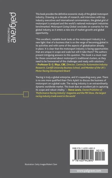 'This excellent, readable, book looks at the motorsport industry in a new light: that of a business that is on the verge of becoming global in its activities and with some of the aspects of globalisation already in place. This involves the consumption of motorsport products through the media and merchandise and the production of inputs that make up motorsport such as circuits, cars and their supply chains. The authors look at various future scenarios to try to identify where the industry is going and the possible winners and losers. It is clear that the motorsport industry is facing opportunities that are unique in scope and scale but will it take them? The authors present intriguing answers to this question. The process of globalisation means that new countries will challenge the existing motorsport clusters but will also demand a more sustainable industry. The industry's response to the latter could place it mainstream in the world's automotive industry as never before. This bookis a must read for those concerned about motorsport's traditional clusters, as they need to be forewarned of the challenges and ready with solutions.' Professor D G Rhys CBE, Director, Centre for Automotive Industry Research, Cardiff University Business School and Member of the UK's Motor Racing Development Board.