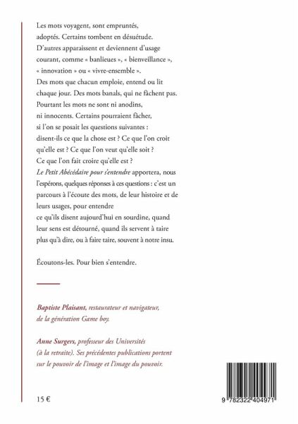 Les mots voyagent, sont empruntés, adoptés. Certains tombent en désuétude. D'autres apparaissent et deviennent d'usage courant, comme "banlieues", "bienveillance", innovation" ou "vivre-ensemble". Des mots que chacun emploie, entend ou lit chaque jour. Des mots banals, qui ne fâchent pas. Pourtant les mots ne sont ni anodins, ni innocents. Certains pourraient fâcher, si l'on se posait les questions suivantes: disent-ils ce que la chose est? Ce que l'on croit qu'elle est? Ce que l'on veut qu'elle soit? ou ce que l'on fait croire qu'elle est? Le Petit Abécédaire pour s'entendre apportera, nous l'espérons, quelques réponses à ces questions: c'est un voyage à l'écoute des mots, de leur histoire et de leurs usages, pour entendre ce qu'ils disent aujourd'hui en sourdine, quand leur sens est détourné, quand ils servent à taire plus qu'à dire, ou à faire taire, souvent à notre insu. Ecoutons-les. Pour bien s'entendre.