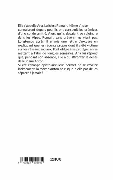 Elle s'appelle Ana. Lui, c'est Romain. Même s'ils se connaissent depuis peu, ils ont construit les prémices d'une solide amitié. Alors qu'ils devaient se rejoindre dans les Alpes, Romain, sans prévenir, ne vient pas. Longtemps après, il envoie une lettre d'excuses en expliquant que les récents propos dont il a été victime sur les réseaux sociaux, l'ont obligé à se protéger en se mettant à l'abri de longues semaines. Ana lui répond que, pendant son absence, elle a dû affronter le décès de leur ami Anton. Si cet échange épistolaire leur permet de se révéler intimement, la mort d'Anton ne risque-t-elle pas de les séparer à jamais ?
