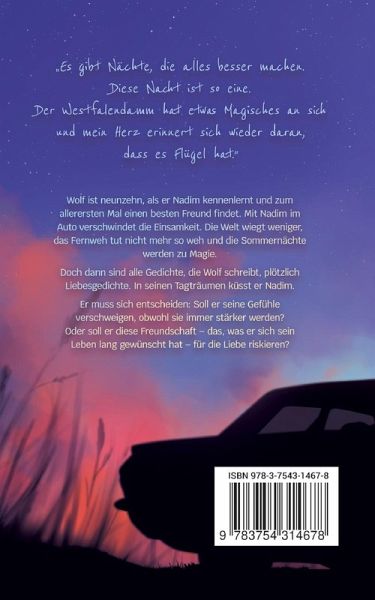 »Es gibt Nächte, die alles besser machen. Diese Nacht ist so eine. Der Westfalendamm hat etwas Magisches an sich und mein Herz erinnert sich wieder daran, dass es Flügel hat.«Wolf ist neunzehn, als er Nadim kennenlernt und zum allerersten Mal einen besten Freund findet. Mit Nadim im Auto verschwindet die Einsamkeit. Die Welt wiegt weniger, das Fernweh tut nicht mehr so weh und die Sommernächte werden zu Magie.Doch dann sind alle Gedichte, die Wolf schreibt, plötzlich Liebesgedichte. In seinen Tagträumen küsst er Nadim.Er muss sich entscheiden:Soll er seine Gefühle verschweigen, obwohl sie immer stärker werden? Oder soll er diese Freundschaft - das, was er sich sein Leben lang gewünscht hat - für die Liebe riskieren?