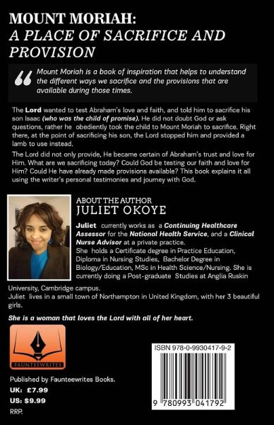 The Lord wanted to test Abraham's love and faith, and told him to sacrifice his son Isaac (who was the child of promise). He did not doubt God or ask questions, rather he obediently took the child to Mount Moriah to sacrifice. Right there, at the point of sacrificing his son, the Lord stopped him and provided a lamb to use instead.The Lord did not only provide, but He also became certain of Abraham's trust and love for Him. What are we sacrificing today? Could God be testing our faith and love for Him? Could He have already made provisions available? This book explains it all using the writer's personal testimonies and journey with God.