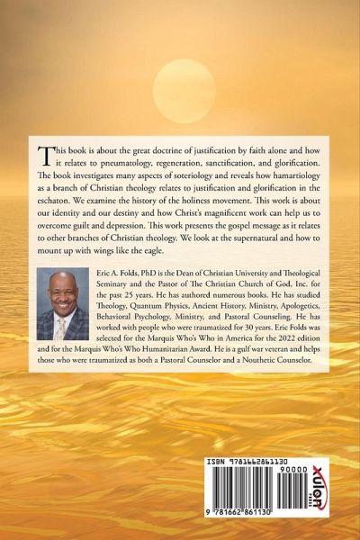 This book is about the great doctrine of justification by faith alone and how it relates to pneumatology, regeneration, sanctification, and glorification. The book investigates many aspects of soteriology and reveals how hamartiology as a branch of Christian theology relates to justification and glorification in the eschaton. We examine the history of the holiness movement. This work is about our identity and our destiny and how Christ's magnificent work can help us to overcome guilt and depression. This work presents the gospel message as it relates to other branches of Christian theology. We look at the supernatural and how to mount up with wings like the eagle. Eric A. Folds, PhD is the Dean of Christian University and Theological Seminary and the Pastor of The Christian Church of God, Inc. for the past 25 years. He has authored numerous books. He has studied Theology, Quantum Physics, Ancient History, Ministry, Apologetics, Behavioral Psychology, Ministry, and Pastoral Counseling. He has worked with people who were traumatized for 30 years. Eric Folds was selected for the Marquis Who's Who in America for the 2022 edition and for the Marquis Who's Who Humanitarian Award. He is a gulf war veteran and helps those who were traumatized as both a Pastoral Counselor and a Nouthetic Counselor.