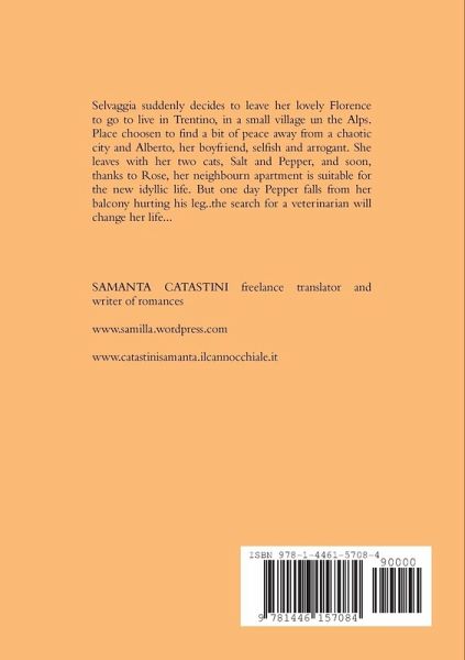 Selvaggia suddenly decides to leave her lovely Florence to go to live in Trentino, in a small village in the Alps. Place choosen to find a bit of peace away from a chaotic city and from Alberto, her boyfriend, selfish and arrogant. She leaves with her two cats, Salt and Pepper, and soon, thanks to Rose, her neighbourn apartament, is suitable for the new idyllic life. But one day Pepper falls from her balcony hurting his leg...the search for a veterinarian will change her life.... -------------------------------------------------- Buying or downloading this book you donnate 50 cents to the IHP association for the safety and the health of maltreated horses http://www.horseprotection.it THANKS!