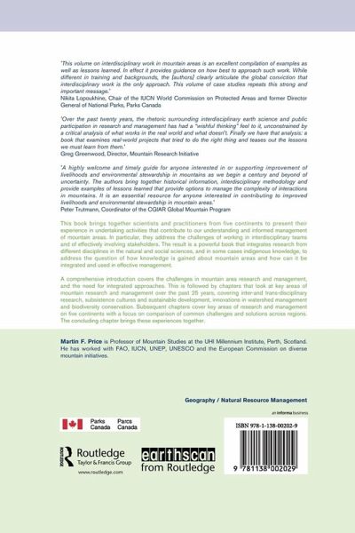 This book brings together scientists and practitioners from five continents to present their experience in undertaking activities that contribute to our understanding and informed management of mountain areas. In particular, they address the challenges of working in interdisciplinary teams and of effectively involving stakeholders. The result is a powerful book that integrates research from different disciplines in the natural and social sciences, and in some cases indigenous knowledge, to address the question of how knowledge is gained about mountain areas and how can it be integrated and used in effective management. A comprehensive introduction covers the challenges in mountain area research and management, and the need for integrated approaches. This is followed by chapters that look at key areas of mountain research and management over the past 25 years, covering inter-and trans-disciplinary research, subsistence cultures and sustainable development, innovations in watershed management and biodiversity conservation. Subsequent chapters cover key areas of research and management on five continents with a focus on comparison of common challenges and solutions across regions. The concluding chapter brings these experiences together. Published with Parks Canada