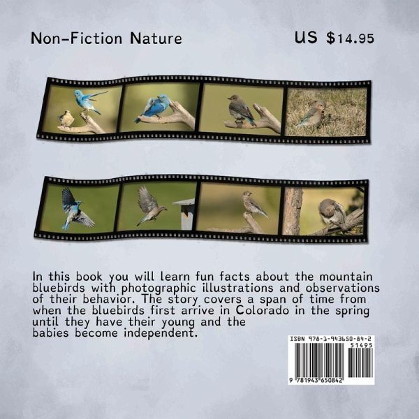 In this book you will learn fun facts about mountain bluebirds (Siala currucoides) with photographic illustrations and observations of their behavior. The story covers a span of time from when the bluebirds first arrive in Colorado in the spring until they have their young and the babies become independent.There are two species of bluebirds in Colorado. The western bluebird (Siala mexicana) can be readily recognized by the red feathers on the male's breast. The mountain bluebird, (S. currucoides) on the other hand has white feathers on the male's breast. The female mountain bluebird is pale sky-blue with a light-colored chin, a brownish back and may have a rufous tint on her breast in early spring. This book is about the mountain bluebird.