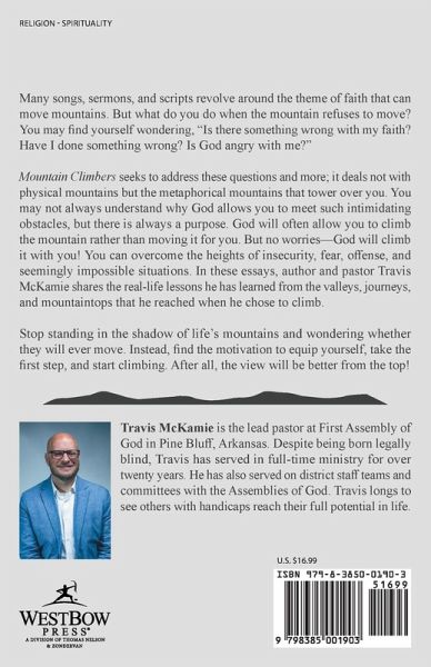 Many songs, sermons, and scripts revolve around the theme of faith that can move mountains. But what do you do when the mountain refuses to move? You may find yourself wondering, "Is there something wrong with my faith? Have I done something wrong? Is God angry with me?" Mountain Climbers seeks to address these questions and more; it deals not with physical mountains but the metaphorical mountains that tower over you. You may not always understand why God allows you to meet such intimidating obstacles, but there is always a purpose. God will often allow you to climb the mountain rather than moving it for you. But no worries-God will climb it with you! You can overcome the heights of insecurity, fear, offense, and seemingly impossible situations. In these essays, author and pastor Travis McKamie shares the real-life lessons he has learned from the valleys, journeys, and mountaintops that he reached when he chose to climb. Stop standing in the shadow of life's mountains and wondering whether they will ever move. Instead, find the motivation to equip yourself, take the first step, and start climbing. After all, the view will be better from the top!