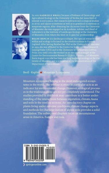 Mountain ecosystems belong to the most endangered ecosystems in the world. Especially, the treeline ecotone acts as an indicator for environmental change. However, ecological processes in the treeline ecotone are not yet completely understood. The studies provided in this book may contribute to a better understanding of the interactions between vegetation, climate, fauna, and soils in the treeline ecotone. An introductory chapter is given on plants living under extreme conditions, climate change aspects, and methods for characterization of alpine soils. The following articles focus on mountainous areas in America, Europe and Asia. The Working Group on Mountain and Northern Ecosystems at the Insti- te of Landscape Ecology, University of Münster (Germany), has been working on topics related to the treeline ecotone for several decades. This period under the chairmanship of Friedrich-Karl Holtmeier has come to an end now when he retired in 2004. He initiated numerous studies in high mountains and in the North. Many of his students, who became infected by the 'mountain virus', will continue these investigations on ecological processes in the altitudinal and northern treeline ecotones. With this compilation of studies in mountain ecosystems we want to thank Friedrich-Karl Holtmeier for his excellent guidance in these cold and fascinating environments.