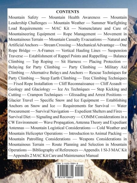 CONTENTS Mountain Safety Mountain Health Awareness Mountain Leadership Challenges Mountain Weather Summer Warfighting Load Requirements MAC Kit Nomenclature and Care of Mountaineering Equipment Rope Management Movement in Mountainous Terrain Mountain Casualty Evacuations Natural and Artificial Anchors Stream Crossing Mechanical Advantage One Rope Bridge A-Frames Vertical Hauling Lines Suspension Traverse Establishment of Rappel Points and Rappelling Balance Climbing Top Roping Sit Harness Placing Protection Belaying for Party Climbing Party Climbing Military Aid Climbing Alternative Belays and Anchors Rescue Techniques for Party Climbing Steep Earth Climbing Tree Climbing Techniques Fixed Rope Installation Cliff Reconnaissance Cliff Assault Geology and Glaciology Ice Ax Techniques Step Kicking and Cutting Crampon Techniques Glissading and Arrest Positions Glacier Travel Specific Snow and Ice Equipment Establishing Anchors on Snow and Ice Requirements for Survival Water Procurement Survival Navigation Expedient Shelters and Fires Survival Diet Signaling and Recovery COMM Considerations in a CW Environment Wave Propagation, Antenna Theory and Expediant Antennas Mountain Logistical Considerations Cold Weather and Mountain Helicopter Operations Introduction to Animal Packing Mountain Patrolling Considerations Weapons Considerations in Mountainous Terrain Route Planning and Selection in Mountain Operations Bibliography of References Appendix 1 Sl-3 MAC Kit Appendix 2 MAC Kit Care and Maintenance Manual