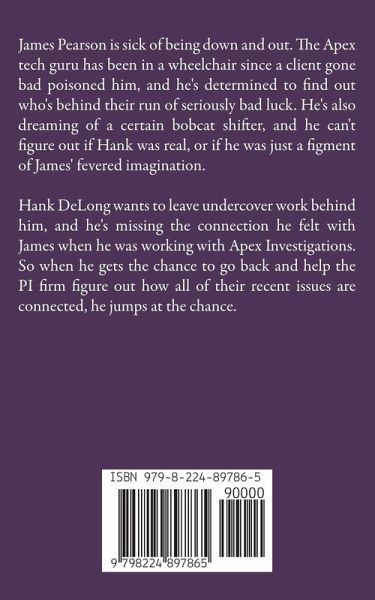 James Pearson is sick of being down and out. The Apex tech guru has been in a wheelchair since a client gone bad poisoned him, and he's determined to find out who's behind their run of seriously bad luck. He's also dreaming of a certain bobcat shifter, and he can't figure out if Hank was real, or if he was just a figment of James' fevered imagination. Hank DeLong wants to leave undercover work behind him, and he's missing the connection he felt with James when he was working with Apex Investigations. So when he gets the chance to go back and help the PI firm figure out how all of their recent issues are connected, he jumps at the chance.
