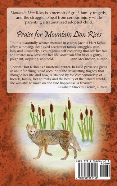 Mountain Lion Rises is a memoir of grief and family tragedy due to the death of a child. The author struggles to recover from serious injury while parenting a challenging, traumatized adopted child. Both her husband and adoptive son were killed in the horrific accident that dramatically changed the course of all their lives. She finds some solace from her strong connection with animals, both wild and domestic. Through facets of nature, strange encounters, and the commitment of friends and community, Hart Kehoe tells the greater story of healing from trauma and single parenting during a time of crisis. As the author describes it: "This crisis prompted my writing of the incident: One bright, cold December Sunday in 2003, my family headed to Iowa City for Elizabeth's and Raymond's recitals. No one, however, got to hear the music. No sooner had we gotten on the I-80 on-ramp when traffic slowed to a stop. As we pulled up with the other travelers, the unmistakable sound of air brakes and the low groan of an approaching semi's horn came from behind. Instinctively I felt compelled to move the van off the road. But I wasn't driving. I urged my husband to press on the accelerator and drive quickly away from the scene. What I remember next: My husband slumped over, my son unnaturally slung out in the back seat, and my daughter's cries. My physical recovery began at the University of Iowa Hospital where I floated in and out of consciousness for several days. Other recoveries would stretch over years. My husband and son now dead, I had to care for my pre-teen adoptive daughter-already traumatized from early childhood abuse and suffering from reactive attachment disorder. I also had dogs, cats, a horse, and a newly built home in the Iowa countryside near the Cedar River. I did not want to lose any of these, though it meant managing all in spite of cognitive and emotional confusion."