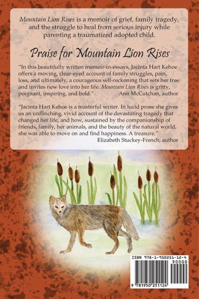 Mountain Lion Rises is a memoir of grief and family tragedy due to the death of a child. The author struggles to recover from serious injury while parenting a challenging, traumatized adopted child. Both her husband and adoptive son were killed in the horrific accident that dramatically changed the course of all their lives. She finds some solace from her strong connection with animals, both wild and domestic. Through facets of nature, strange encounters, and the commitment of friends and community, Hart Kehoe tells the greater story of healing from trauma and single parenting during a time of crisis. As the author describes it: "This crisis prompted my writing of the incident: One bright, cold December Sunday in 2003, my family headed to Iowa City for Elizabeth's and Raymond's recitals. No one, however, got to hear the music. No sooner had we gotten on the I-80 on-ramp when traffic slowed to a stop. As we pulled up with the other travelers, the unmistakable sound of air brakes and the low groan of an approaching semi's horn came from behind. Instinctively I felt compelled to move the van off the road. But I wasn't driving. I urged my husband to press on the accelerator and drive quickly away from the scene. What I remember next: My husband slumped over, my son unnaturally slung out in the back seat, and my daughter's cries. My physical recovery began at the University of Iowa Hospital where I floated in and out of consciousness for several days. Other recoveries would stretch over years. My husband and son now dead, I had to care for my pre-teen adoptive daughter-already traumatized from early childhood abuse and suffering from reactive attachment disorder. I also had dogs, cats, a horse, and a newly built home in the Iowa countryside near the Cedar River. I did not want to lose any of these, though it meant managing all in spite of cognitive and emotional confusion."