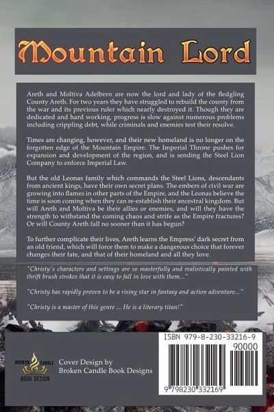 Areth and Moltiva Adelbern are the lord and lady of the fledgling County Areth. Together, they face tremendous obstacles and responsibilities in building their new domain. But neither can foresee the brewing storm which crawls toward them, a storm that threatens the very foundation of the Empire. With the recent failure of the Gold Lions, the Steel Lion Company has been assigned to this frontier region to enforce Imperial law. With uprisings and rebel kings popping up like weeds, the Empress is tightening control, especially in frontier lands such as County Areth, always alert for who might need to be weeded out. In his efforts to create prosperity, Areth has discovered a means to save his homeland. But it will jeopardize his relations with the Imperial Throne--creating a dangerous situation with his new neighbors, the Steel Lions and bring the unwanted attention of the Throne. But even as Areth and Moltiva work toward peace, the coming storm breaks upon them. To save their homeland, Areth must turn enemies into allies and turn his back against all that he had once been loyal. For he has discovered the Empress' dark secret, the heart of that storm, that will shatter an Empire.
