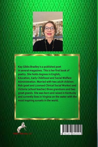 Kay Gibbs Bradley is a published poet in several magazines. This is her first book of poetry. She holds degrees in English, Education, Early Childhood and Social Welfare Administration. Married with two adult children: Rob (poet and Licensed Clinical Social Worker) and Victoria (school teacher) three grandsons and two great grands. She was born and raised in Kentucky and currently lives in Virginia on the water with the most inspiring sunsets in the world.