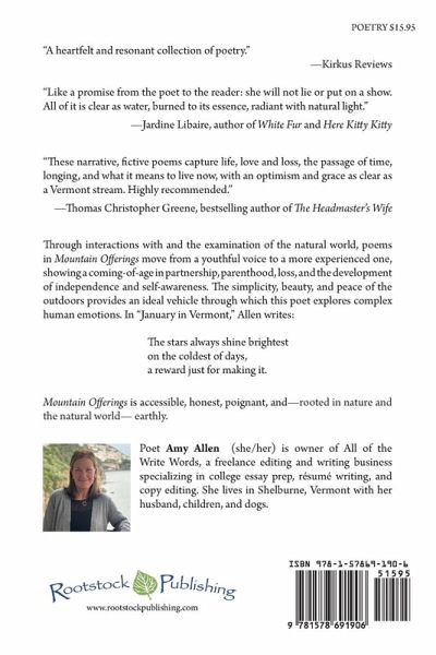 Through interactions with and the examination of the natural world, poems in Mountain Offerings move from a youthful voice to a more experienced one, showing a coming-of-age in partnership, parenthood, loss, and the development of independence and self-awareness. The simplicity, beauty, and peace of the outdoors provides an ideal vehicle through which this poet explores complex human emotions. In "January in Vermont," Allen writes: The stars always shine brightest on the coldest of days, a reward just for making it. Mountain Offerings is accessible, honest, poignant, and-rooted in nature and the natural world-earthly.