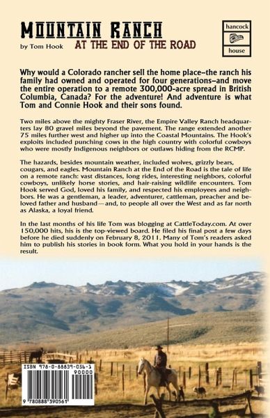 Why would a Colorado rancher sell the home place-the ranch his family had owned and operated for four generations-and move the entire operation to a remote 300,000-acre spread in British Columbia, Canada? For the adventure! And adventure is what Tom and Connie Hook and their sons found. Two miles above the mighty Fraser River, the Empire Valley Ranch headquarters lay 80 gravel miles beyond the pavement. The range extended another 75 miles further west and higher up into the Coastal Mountains. The Hook's exploits included punching cows in the high country with colorful cowboys who were mostly Indigenous neighbors or outlaws hiding from the RCMP. The hazards, besides mountain weather, included wolves, grizzly bears, cougars, and eagles. Mountain Ranch at the End of the Road is the tale of life on a remote ranch: vast distances, long rides, interesting neighbors, colorful cowboys, unlikely horse stories, and hair-raising wildlife encounters. Tom Hook served God, loved his family, and respected his employees and neighbors. He was a gentleman, a leader, adventurer, cattleman, preacher and beloved father and husband-and, to people all over the West and as far north as Alaska, a loyal friend. In the last months of his life Tom was blogging at CattleToday.com. At over 150,000 hits, his is the top-viewed board. He filed his final post a few days before he died suddenly on February 8, 2011. Many of Tom's readers asked him to publish his stories in book form. What you hold in your hands is the result.
