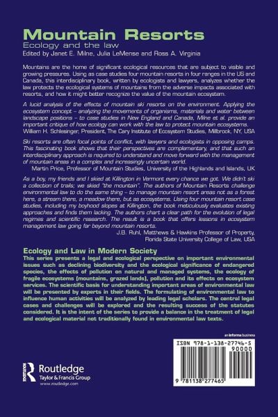 Preface; Chapter 1 The Landscape of This Book Janet E. Milne; Part I The Mountain Ecosystem; Chapter 2 An Ecosystem Approach to Mountain Resorts Ross A. Virginia; Chapter 3 Plant Communities and Vegetation Processes in the Mountain Landscape G. Richard Strimbeck; Chapter 4 Water Quantity and Quality in the Mountain Environment James B. Shanley Beverley Wemple; Chapter 5 Effects of Mountain Resorts on Wildlife Allan M. Strong Christopher C. Rimmer Kent P. McFarland Kimberly Hagen; Part II Loon Mountain New Hampshire Roger Fleming; Chapter 6 An Introduction to Loon Mountain and the Loon Resort Roger Fleming; Chapter 7 The Legal Foundation for the South Mountain Expansion Proposal Roger Fleming; Chapter 8 The South Mountain Expansion Roger Fleming; Chapter 9 Can Other Federal Laws Contribute to an Ecosystem-Based Approach to Resort Development? Roger Fleming; Chapter 10 Conclusions from the Loon Resort Experience Roger Fleming; Part III Whiteface Mountain Ski Center New York John S. Banta; Chapter 11 An Introduction to the Whiteface Mountain Ski Center and the Legal Framework John S. Banta; Chapter 12 The Legal Regime Affecting Whiteface Mountain John S. Banta; Chapter 13 The Legal Regime Affecting Private Lands Around Whiteface John S. Banta; Chapter 14 Conclusion John S. Banta; Part IV Killington Resort Vermont Julia LeMense Jonathan Isham; Chapter 15 An Introduction to Killington Resort its Expansion Plans and the Issues Julia LeMense Jonathan Isham; Chapter 16 Vermont's Act 250 and the Early Battles at Parker's Gore East Julia LeMense Jonathan Isham; Chapter 17 Expansion in the Wake of Parker's Gore East Julia LeMense Jonathan Isham; Chapter 18 Conclusion Julia LeMense Jonathan Isham; Part V Mont Tremblant Quebec Jane Matthews Glenn; Chapter 19 An Introduction to Mont Tremblant and the Issues Jane Matthews Glenn; Chapter 20 Intrawest's Development of the Skiable Domain Jane Matthews Glenn; Chapter 21 Base Camps Golf Courses and Land Protection at the Mountain's Base Jane Matthews Glenn; Chapter 22 Legal Diversity and Legal Ecosystems Jane Matthews Glenn; Part VI A Vision for the Mountains; Chapter 23 The Challenges of Joining Ecology with the Law Janet E. Milne Ross A. Virginia;