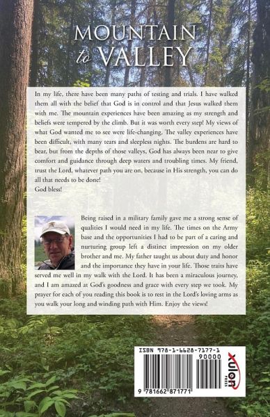In my life, there have been many paths of testing and trials. I have walked them all with the belief that God is in control and that Jesus walked them with me. The mountain experiences have been amazing as my strength and beliefs were tempered by the climb. But it was worth every step! My views of what God wanted me to see were life-changing. The valley experiences have been difficult, with many tears and sleepless nights. The burdens are hard to bear, but from the depths of those valleys, God has always been near to give comfort and guidance through deep waters and troubling times. My friend, trust the Lord, whatever path you are on, because in His strength, you can do all that needs to be done! God bless! Being raised in a military family gave me a strong sense of qualities I would need in my life. The times on the Army base and the opportunities I had to be part of a caring and nurturing group left a distinct impression on my older brother and me. My father taught us about duty and honor and the importance they have in your life. Those traits have served me well in my walk with the Lord. It has been a miraculous journey, and I am amazed at God's goodness and grace with every step we took. My prayer for each of you reading this book is to rest in the Lord's loving arms as you walk your long and winding path with Him. Enjoy the views!