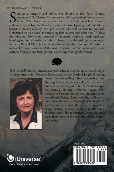 Substance, integrity and selfless love abound in the North Georgia mountains! Dr. Clarence Drummond a well-respected minister expressed it best, "Silvia has written a masterpiece! In the depiction of her characters and this story she has plumbed the depths of human depravity and reached the heights of human nobility." He "predicts that MT will do more to transform Christian faith than has all the preaching that has ever been done here". Unlike the ridiculous Hollywood portrayal of mountain people as uneducated and bootleggers, Fontaine paints a realistic picture of an almost-forgotten moment in the 1930s and 1940s before the invasion of the electronic age. Through the intense love and heartache of the main character Latrelle comes alive as she matures from a young farm girl into an intelligent insightful woman.