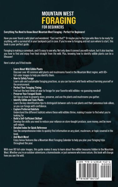 Everything You Need to Know About Mountain West Foraging - Perfect for Beginners! Have you ever found a wild plant and wondered, "Can I eat that?" Or maybe you're the type who likes to be ready for anything, with a survival kit in your backpack just in case. If you're new to foraging and not sure where to start, this book is your perfect guide. Foraging is making a comeback, and it's easy to see why. Not only does it connect you with nature, but it also teaches you how to find and enjoy free food straight from the wild. Plus, knowing how to identify edible plants can be a lifesaver! Here's what you'll find inside:Learn About Wild Edible Plants: Discover over 40 common wild plants and mushrooms found in the Mountain West region, with 60+ full-color images to help you identify them. How to Safely Forage: Learn safe and sustainable foraging practices, so you can harvest wild foods without harming yourself or the environment. Perfect Your Foraging Timing: Find out the best times of year to forage for your favorite wild edibles-no guessing needed! Preserve Your Foraged Goods: Get tips on how to properly store, preserve, and use the plants and mushrooms you gather. Identify Edible and Toxic Plants: Learn the key identification tips to distinguish between safe-to-eat plants and their poisonous look-alikes, so you can forage with confidence. Explore Preferred Habitats: Understand the different habitats where these wild edibles thrive, making it easier to find what you're looking for. Build a Self-Sufficient Skillset: Develop the skills you need to reduce your reliance on store-bought produce, save money, and be more self-reliant. Detailed Index for Quick Reference: Use the comprehensive index to quickly find information on any plant, mushroom, or topic covered in the book. And Much More! Enjoy bonus features like a Mountain West Foraging Calendar to help you plan your foraging trips throughout the year. With over 80 full-color images, this guide makes it easy to learn about the edible treasures hidden in the Mountain West. Whether you're an outdoor adventurer, a homesteader, or just someone who loves nature, this book will change how you see the wild. Start your foraging journey today-click "Add to Cart" and embrace a more sustainable, budget-friendly lifestyle!