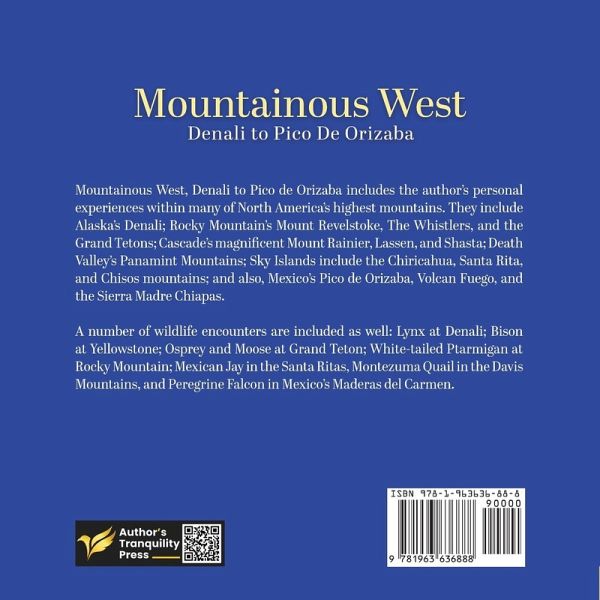 Mountainous West, Denali to Pico de Orizaba includes the author's personal experiences within many of North America's highest mountains. They include Alaska's Denali; Rocky Mountain's Mount Revelstoke, The Whistlers, and the Grand Tetons; Cascade's magnificent Mount Rainier, Lassen, and Shasta; Death Valley's Panamint Mountains; Sky Islands include the Chiricahua, Santa Rita, and Chisos mountains; and also, Mexico's Pico de Orizaba, Volcan Fuego, and the Sierra Madre Chiapas. A number of wildlife encounters are included as well: Lynx at Denali; Bison at Yellowstone; Osprey and Moose at Grand Teton; White-tailed Ptarmigan at Rocky Mountain; Mexican Jay in the Santa Ritas, Montezuma Quail in the Davis Mountains, and Peregrine Falcon in Mexico's Maderas del Carmen.