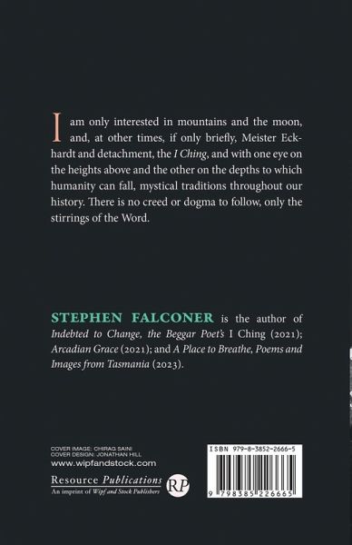 I am only interested in mountains and the moon, and, at other times, if only briefly, Meister Eckhardt and detachment, the I Ching, and with one eye on the heights above and the other on the depths to which humanity can fall, mystical traditions throughout our history. There is no creed or dogma to follow, only the stirrings of the Word.