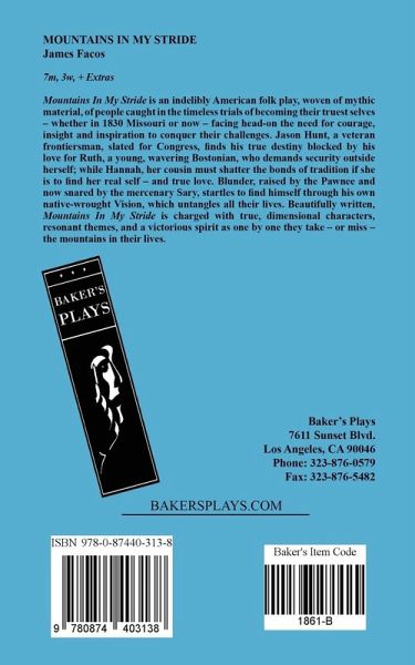 7m, 3w, + Extras Mountains In My Stride is an indelibly American folk play, woven of mythic material, of people caught in the timeless trials of becoming their truest selves - whether in 1830 Missouri or now - facing head-on the need for courage, insight and inspiration to conquer their challenges. Jason Hunt, a veteran frontiersman, slated for Congress, finds his true destiny blocked by his love for Ruth, a young, wavering Bostonian, who demands security outside herself; while Hannah, her cous