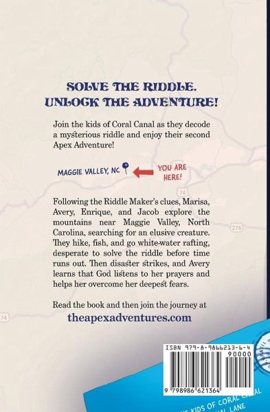 A mystery envelope, a riddle, and time is running out... A strange blue envelope greets the kids of Coral Canal right before their Easter trip to Maggie Valley, North Carolina. Inside it contains a riddle and a set of instructions. Nobody, not even their parents, seems to know who sent the riddle, and the children only have five days to solve it and send photographic proof. With hard work, humor, and perseverance, Marisa, Avery, Enrique, and Jacob attempt to fulfill the riddle's demands. Together they research, hike, fish, and go white-water rafting, desperate to solve the riddle before time runs out. Then disaster strikes, and Avery learns that God listens to her prayers and helps her overcome her deepest fears. Mountain's Mystery will engage young readers who love mystery, humor, and clean, age-appropriate antics. They won't be able to put the book down until THE END and will be left wishing for the next riddle! Mountain's Mystery is the second book in the Apex Adventures children's series. Solve the riddle. Unlock the adventure!