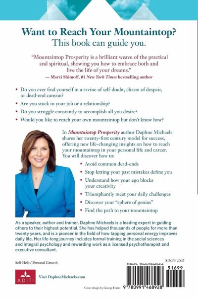 Want to Reach Your Mountaintop? This book can guide you.* Do you ever find yourself in a ravine of self-doubt, chasm of despair,or dead-end canyon?* Are you stuck in your job or a relationship?* Do you struggle constantly to accomplish all you desire?* Would you like to reach your own mountaintop but don't know how? In Mountaintop Prosperity author Daphne Michaels shares her twenty-first century model for success, offering new life-changing insights on how to reach your mountaintop in your personal life and career. You will discover how to: * Avoid common dead ends * Stop letting your past mistakes define you * Understand how your ego blocks your creativity * Triumphantly meet your daily challenges * Discover your "sphere of genius" * Find the path to your mountaintop. This book features eleven chapters and a workbook section which highlights thought provoking questions to assist you in climbing to your mountaintop!
