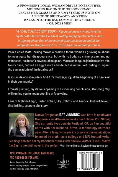 A prominent local woman drives to beautiful Mourning Bay on the Oregon coast, leaves her glasses and a mysterious note on a piece of driftwood, and then walks into the bay, committing suicide - or does she? Police chief Matt Horning makes a promise to the woman's grieving husband to investigate her disappearance, but with no body, no crime scene, and no witnesses, he doesn't have much to go on. Matt's colleagues join in to solve this twisty case, but will an aggressive new detective in the Port Stirling PD upset the camaraderie of the local cops? Is it suicide or is it murder? And if it's murder, is it just the beginning of a new evil in their community? From its puzzling, mysterious opening to its shocking conclusion, Mourning Bay will remind you to not accept life at face value. Fans of Melinda Leigh, Harlan Coben, Elly Griffiths, and Kendra Elliot will devour this thrilling, suspenseful story.