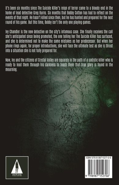 It's been six months since The Suicide Killer's reign of terror came to a bloody end in the home of lead detective Greg Burns. Six months that Bobby Cotton has had to reflect on the events of that night. He hasn't killed since then, but he has hunted and prepared for the next round of his game. But this time, Bobby isn't the only one playing games. Ivy Chandler is the new detective on the city's infamous case. She finally receives the call she's anticipated since being promoted, the one telling her The Suicide Killer has surfaced, and she is determined not to make the same mistakes as her predecessor. But when her phone rings again, for proper introductions, she will face the ultimate test as she is thrust into a situation she is not fully prepared for. Now, Ivy and the citizens of Crystal Valley are squarely in the path of a sadistic killer who is ready to lead them through his darkness to teach them that true glory is found in the mourning.