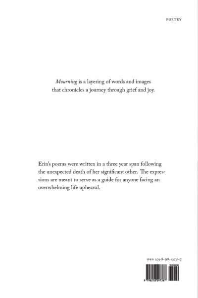 "Mourning" is a layering of words and images that chronicles a journey through grief and joy. Erin's poems were written in a three year span following the unexpected death of her significant other. The expressions are meant to serve as a guide for anyone facing an overwhelming life upheaval.