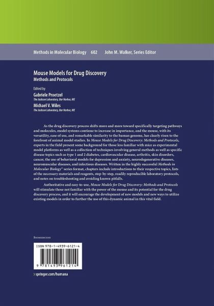 Authoritative and easy-to-use, Mouse Models for Drug Discovery: Methods and Protocols will stimulate those not familiar with the power of the mouse and its potential for the drug discovery process, and it will encourage the development of new models and new ways to utilize existing models in order to further the use of this dynamic animal in this vital field.