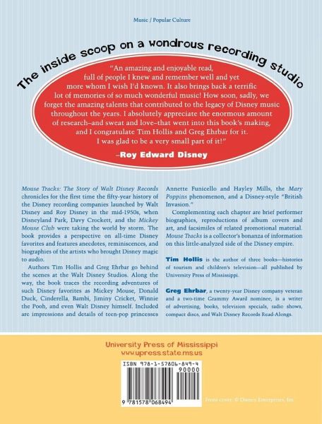 Around the world there are grandparents, parents, and children who can still sing ditties by Tigger or Baloo the Bear or the Seven Dwarves. This staying power and global reach is in large part a testimony to the pizzazz of performers, songwriters, and other creative artists who worked with Walt Disney Records. Mouse Tracks: The Story of Walt Disney Records chronicles for the first time the fifty-year history of the Disney recording companies launched by Walt Disney and Roy Disney in the mid-1950s, when Disneyland Park, Davy Crockett, and the Mickey Mouse Club were taking the world by storm. The book provides a perspective on all-time Disney favorites and features anecdotes, reminiscences, and biographies of the artists who brought Disney magic to audio. Authors Tim Hollis and Greg Ehrbar go behind the scenes at the Walt Disney Studios and discover that in the early days Walt Disney and Roy Disney resisted going into the record business before the success of The Ballad of Davy Crockett ignited the in-house label. Along the way, the book traces the recording adventures of such Disney favorites as Mickey Mouse, Donald Duck, Cinderella, Bambi, Jiminy Cricket, Winnie the Pooh, and even Walt Disney himself. Mouse Tracks reveals the struggles, major successes, and occasional misfires. Included are impressions and details of teen-pop princesses Annette Funicello and Hayley Mills, the Mary Poppins phenomenon, a Disney-style British Invasion, and a low period when sagging sales forced Walt Disney to suggest closing the division down. Complementing each chapter are brief performer biographies, reproductions of album covers and art, and facsimiles of related promotional material. Mouse Tracks is a collector's bonanza of information on this little-analyzed side of the Disney empire. Learn more about the book and the authors at www.mousetracksonline.com.
