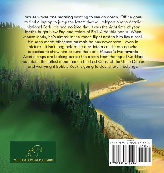 Mouse wakes one morning wanting to see an ocean! Off he goes to find a laptop to jump the letters that will teleport him to Acadia National Park. He had no idea that it was the right time of year for the bright New England colors of Fall. A double bonus. When Mouse lands, it's almost in the water. Right next to him lies a seal. He soon meets other sea animals he has never seen-even in pictures. It isn't long before he runs into a cousin mouse who is excited to show him around the park. Mouse's two favorite Acadia stops are looking across the ocean from the top of Cadillac Mountain, the tallest mountain on the East Coast of the United States, and worrying if Bubble Rock will stay where it belongs. Positive themes throughout, such as :Educational Content: Introduces children to the geography and wildlife of Acadia National Park. Colorful Illustrations: Engages young readers with vibrant, detailed images of the park and its inhabitants. Seasonal Themes: Highlights the beauty of New England's fall foliage, offering a visual treat and learning opportunity. Family Values: Showcases exploration, curiosity, and bonding themes as Mouse connects with his cousin. Adventure and Safety: Encourages safe exploration and respect for nature through Mouse's careful and curious adventures. Interactive Elements: Promotes engagement with nature and geography, sparking interest in real-world locations and travel. Mouse Visits Acadia National Park is a fun and educational book for home and school libraries!