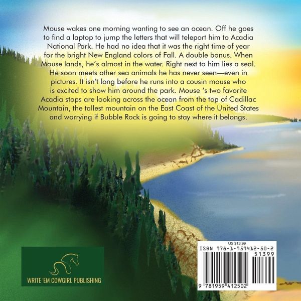 Mouse wakes one morning wanting to see an ocean. Off he goes to find a laptop to jump the letters that will teleport him to Acadia National Park. He had no idea that it was the right time of year for the bright New England colors of Fall. A double bonus. When Mouse lands, it's almost in the water. Right next to him lies a seal. He soon meets other sea animals he has never seen-even in pictures. It isn't long before he runs into a cousin mouse who is excited to show him around the park. Mouse 's two favorite Acadia stops are looking across the ocean from the top of Cadillac Mountain, the tallest mountain on the East Coast of the United States and worrying if Bubble Rock will stay where it belongs.