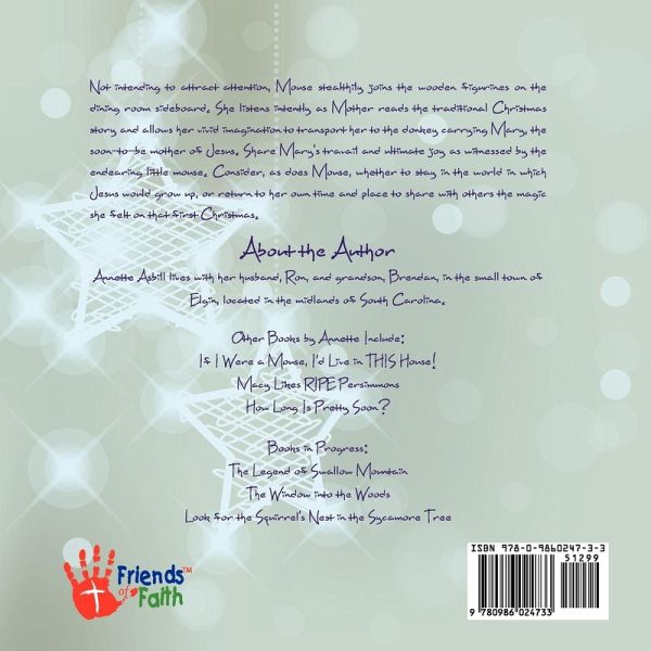 Not intending to attract attention, Mouse stealthily joins the wooden figurines on the dining room sideboard. She listens intently as Mother reads the traditional Christmas story and allows her vivid imagination to transport her to the donkey carrying Mary, the soon-to-be mother of Jesus. Share Mary's travail and ultimate joy as witnessed by the endearing little mouse. Consider, as does Mouse, whether to stay in the world in which Jesus would grow up, or return to her own time and place to share with others the magic she felt on that first Christmas.