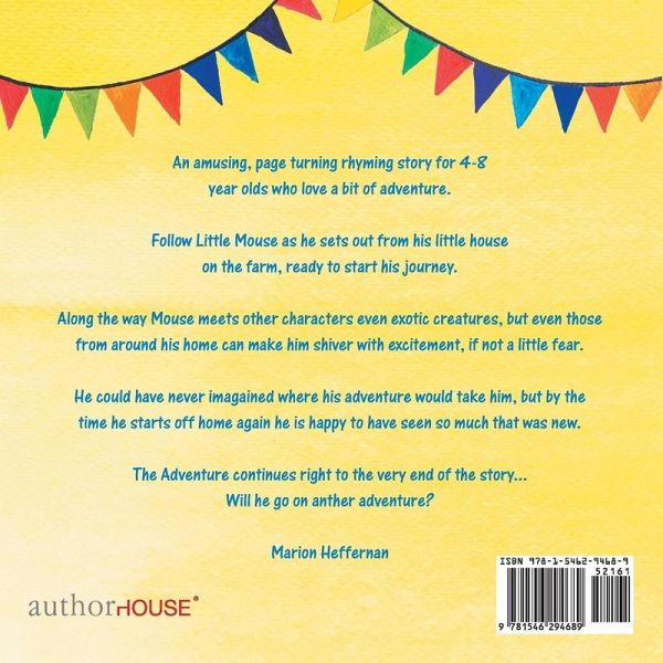 An amusing, page turning rhyming story for 4-8 year olds who love a bit of adventure. Follow Little Mouse as he sets out from his little house on the farm, ready to start his journey. Along the way Mouse meets other characters even exotic creatures, but even those from around his home can make him shiver with excitement, if not a little fear. He could have never imagained where his adventure would take him, but by the time he starts off home again he is happy to have seen so much that was new. The Adventure continues right to the very end of the story... Will he go on anther adventure? Marion Heffernan