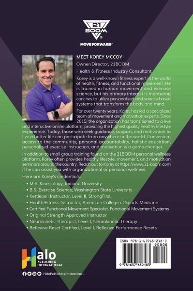 MEET KOREY MCCOYOwner/Director, 21BOOMHealth & Fitness Industry ConsultantKorey is a well-known fitness expert in the world of health, fitness, and functional movement. He is trained in human movement and exercise science, but his primary interest is mentoring coaches to utilize personalized and science-based systems that transform the body and mind.For over twenty years, Korey has led a specialized team of movement and motivation experts. Since 2015, the organization has transitioned to a live and interactive online platform, providing the highest quality healthy lifestyle experience. Today, those who seek guidance, support, and motivation to live a better life can participate from anywhere in the world. Convenient access to the community, personal accountability, holistic education, personalized exercise instruction, and motivation is a game-changer.In addition to small group training found on the 21BOOM personal wellness platform, Korey often provides healthy lifestyle, movement, and motivation seminars around the country. Reach out to Korey at https://www.21-boom.com if he can assist you with organizational or personal wellness.Here are Korey's credentials:¿ M.S. Kinesiology, Indiana Univerisity¿ B.S. Exercise Science, Washington State University¿ Kettlebell Instructor, Level II, StrongFirst¿ Health/Fitness Instructor, American College of Sports Medicine¿ Certified Functional Movement Specialist, Functional Movement Systems¿ Original Strength Approved Instructor¿ Neurokinetic Therapist, Level I, Neurokinetic Therapy¿ Reflexive Reset Certified, Level I, Reflexive Performance Resets