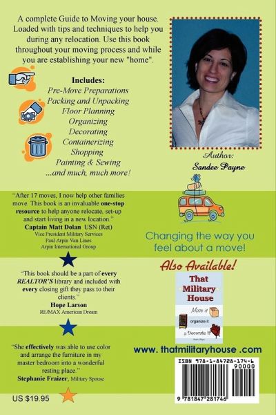 A Complete Guide to Moving. Loaded with tips and techniques to help you during any relocation. Use this book throughout your moving process and while you are establishing your new "home". Chapters include: Pre-Move Preparations, Packing and Unpacking, Floor Planning, Organizing, Decorating, Containerizing, Shopping, Painting & Sewing...and much, much more!