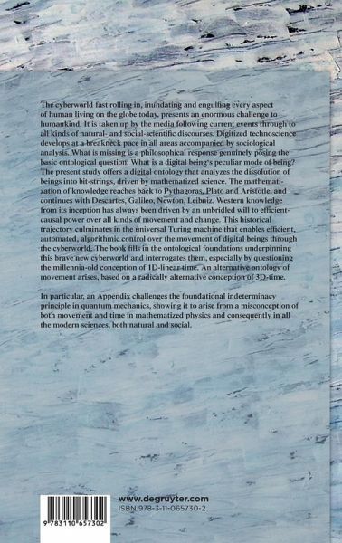 The cyberworld fast rolling in and impacting every aspect of human living on the globe today presents an enormous challenge to humankind. It is taken up by the media following current events through to all kinds of natural- and social-scientific discourses. Digitized technoscience develops at a breakneck pace in all areas accompanied by sociological analysis. What is missing is a philosophical response genuinely posing the basic ontological question: What is a digital being's peculiar mode of being? The present study offers a digital ontology that analyzes the dissolution of beings into bit-strings, driven by mathematized science. The mathematization of knowledge reaches back to Pythagoras, Plato and Aristotle, and continues with Descartes, Galileo, Newton, Leibniz. Western knowledge from its inception has always been driven by an unbridled will to efficient-causal power over all kinds of movement and change. This historical trajectory culminates in the universal Turing machine that enables efficient, automated, algorithmic control over the movement of digital beings through the cyberworld. The book fills in the ontological foundations underpinning this brave new cyberworld and interrogates them, especially by questioning the millennia-old conception of 1D-linear time. An alternative ontology of movement arises, based on a radically alternative conception of 3D-time.