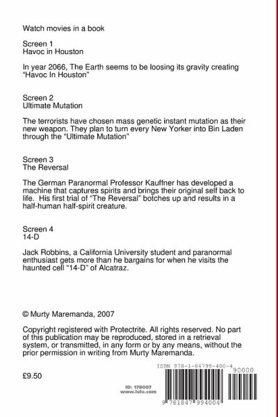 Watch movies in a book. Screen 1 -- Havoc in Houston -- In year 2066, The Earth seems to be loosing its gravity creating "Havoc In Houston" Screen 2 -- Ultimate Mutation -- The terrorists have chosen mass genetic instant mutation as their new weapon. They plan to turn every New Yorker into Bin Laden through the "Ultimate Mutation" Screen 3 -- The Reversal -- The German Paranormal Professor Kauffner has developed a machine that captures spirits and brings their original self back to life. His first trial of "The Reversal" botches up and results in a half-human half-spirit creature. Screen 4 -- 14-D -- Jack Robbins, a California University student and paranormal enthusiast gets more than he bargains for when he visits the haunted cell "14-D" of Alcatraz.