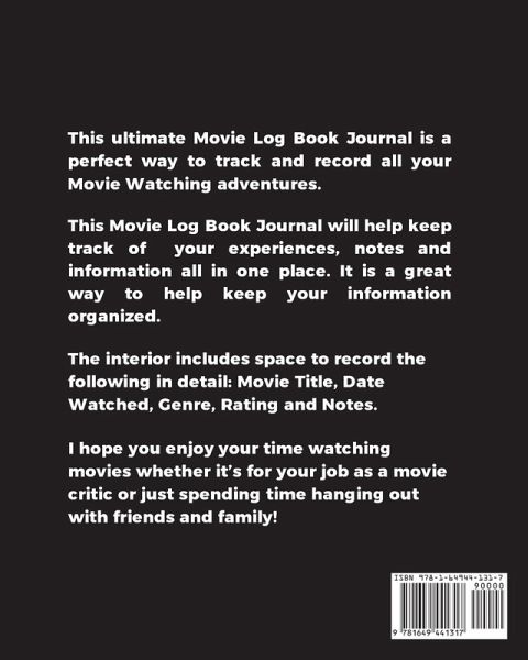 This Movie Log Book is a perfect way to track and write your movie reviews about movies you have seen. Sometimes it's hard to remember all the details you want to remember. With this Movie Tracker Journal, you'll be able to look back and read it. Each interior page includes writing prompts & space for: Movie Title - Name of the movie. Genre - Record which particular genre or specific category the movie falls under. Date Watched - Write the date you watch the movie. Rating - Rate the movie from 1-5 stars. Notes - Write any important details you want to remember such as actors, director, scene information, personal or professional use, was the movie creative, quotes or highlights from the movie, how was the script, etc. Can also make a great gift for the movie buff or every one who loves movies and loves talking about their contents. Made and designed for professional movie critics or personal use. Simple and easy to use. Convenient size is 8x10 inches, 110 pages, soft matte finish cover, white paper, black ink, paperback. Get your copy now!