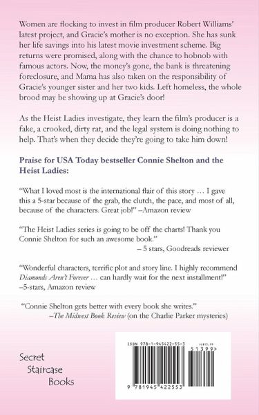 Women are flocking to invest in film producer Robert Williams' latest project, and Gracie's mother is no exception. She has sunk her life savings into his latest movie investment scheme. Big returns were promised, along with the chance to hobnob with famous actors. Now, the money's gone, the bank is threatening foreclosure, and Mama has also taken on the responsibility of Gracie's younger sister and her two kids. Left homeless, the whole brood may be showing up at Gracie's door! As the Heist Ladies investigate, they learn the film's producer is a fake, a crooked, dirty rat, and the legal system is doing nothing to help. That's when they decide they're going to take him down! Praise for USA Today bestseller Connie Shelton and the Heist Ladies: "What I loved most is the international flair of this story … I gave this a 5-star because of the grab, the clutch, the pace, and most of all, because of the characters. Great job!" -Amazon review "The Heist Ladies series is going to be off the charts! Thank you, Connie Shelton for such an awesome book." - 5 stars, Goodreads reviewer "Wonderful characters, terrific plot and story line. I highly recommend Diamonds Aren't Forever … can hardly wait for the next installment!" -5-stars, Amazon review