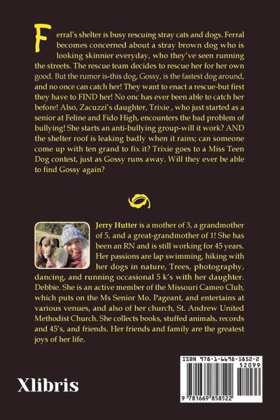 Ferral's shelter is busy rescuing stray cats and dogs. Ferral becomes concerned about a stray brown dog who is looking skinnier everyday, who they've seen running the streets. The rescue team decides to rescue her for her own good. But the rumor is-this dog, Gossy, is the fastest dog around, and no once can catch her! They want to enact a rescue-but first they have to FIND her! No onc has ever been able to catch her before! Also, Zacuzzi's daughter, Trixie , who just started as a senior at Feline and Fido High, encounters the bad problem of bullying! She starts an anti-bullying group-will it work? AND the shelter roof is leaking badly when it rains; can someone come up with ten grand to fix it? Trixie goes to a Miss Teen Dog contest, just as Gossy runs away. Will they ever be able to find Gossy again?