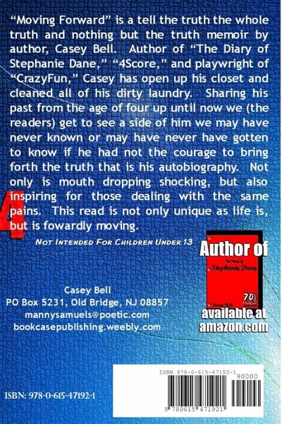 "Moving Forward" is a tell the truth the whole truth and nothing but the truth memoir by author, Casey Bell. Author of "The Diary of Stephanie Dane," "4Score," and playwright of "CrazyFun," Casey has open up his closet and cleaned all of his dirty laundry. Sharing his past from the age of four up until now we (the readers) get to see a side of him we may have never known or may have never have gotten to know if he had not the courage to bring forth the truth that is his autobiography. Not only is mouth dropping shocking, but also inspiring for those dealing with the same pains. This read is not only unique as life is, but is fowardly moving.