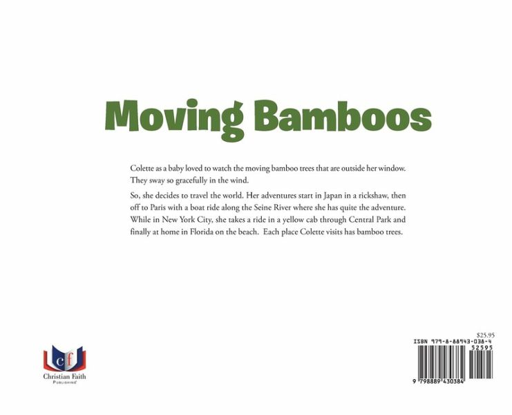 Colette as a baby loved to watch the moving bamboo trees that are outside her window. They sway so gracefully in the wind. So, she decides to travel the world. Her adventures start in Japan in a rickshaw, then off to Paris with a boat ride along the Seine River where she has quite the adventure. While in New York City, she takes a ride in a yellow cab through Central Park and finally at home in Florida on the beach. Each place Colette visits has bamboo trees.