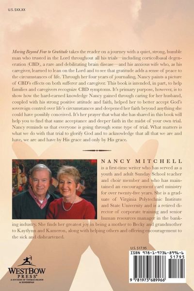 Moving Beyond Fear to Gratitude takes the reader on a journey with a quiet, strong, humble man who trusted in the Lord throughout all his trials-including corticolbasal degeneration (CBD), a rare and debilitating brain disease-and his anxious wife who, as his caregiver, learned to lean on the Lord and to see that gratitude adds a sense of peace to the circumstances of life. Through her four years of journaling, Nancy paints a picture of CBD's effects on both sufferer and caregiver. This book is intended, in part, to help families and caregivers recognize CBD symptoms. It's primary purpose, however, is to show how the hard-earned knowledge Nancy gained through caring for her husband, coupled with his strong positive attitude and faith, helped her to better accept God's sovereign control over life's circumstances and deepened her faith beyond anything she could have possibly conceived. It's her prayer that what she has shared in this book will help you to find that same acceptance and deeper faith in the midst of your own trial. Nancy reminds us that everyone is going through some type of trial. What matters is what we do with that trial to glorify God and to acknowledge that all that we are and have, we are and have by His grace and only by His grace.