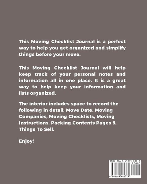 Moving to a new house or home is never an easy task. This moving checklist organizer will help keep you organized with all your important details and information. When the house hunting, purchase and buying for your property is over, you'll need this planner notebook to keep things moving smoothly (pun intended!) There are interior sections for and features: Move Date - where you're moving from (previous residence) and where you're moving to. Moving Companies - Company Contact Name, Address, Phone Number, Email, Cost/Quote, Availability & Notes Moving Checklists - Your list of things to do 2 months, 6 weeks, 1 month, 2 weeks, 3 days before moving day & everything you need on moving day. Moving Instructions For Each Room With Floor Plan Grid - Each room (place for 15 rooms) has space for name of the room and measurements along with furniture checklist & check box/item checklist. Each instruction page is followed by a blank grid page to sketch the layout of furniture. Also has a notes section at the bottom of each floor plan page. Packing Contents Pages -Several pages of lists of box number and inventory of what's in each box. Things To Sell - List your item or items, price and buyer. This planner, organizer is perfect to record and track your upcoming move for all your important information. This planner can help ease the stress of your move. Will also make a great gift for anyone planning a move. Simple and easy to use. Size is 8x10 inches, 90 page, quality white paper, black ink, soft matte finish cover, paperback. Grab one today!